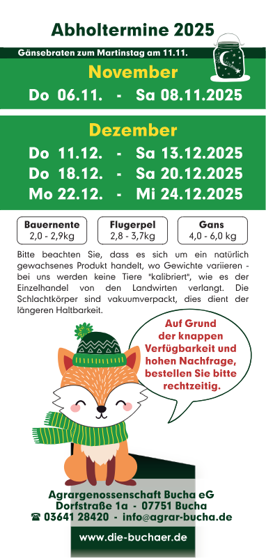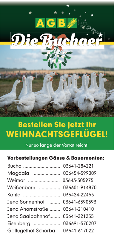 Auch in diesem Jahr bieten wir wieder Weihnachtsgeflügel von unserem Geflügelhof in Schorba an. Bitte bestellen Sie rechtzeitig. Preise Weidegans küchenfertig 18,99€/kg, Enten oder Erpel 16,49€/kg. Bitte haben Sie Verständnis, dass wir pro Bestellung und Tier eine Anzahlung von 20,00€ verlangen, diese wird Ihnen bei Abholung verrechnet. Sie erhalten bei Bestellung und Anzahlung einen Anzahlungsbeleg,…
